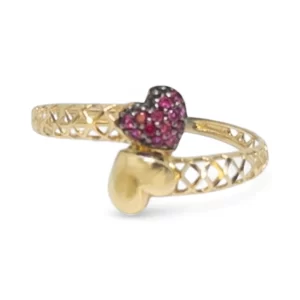 Ouro Amarelo 18k → metal precioso que compõe toda a estrutura do anel, incluindo os corações e o aro com laterais vazadas.
